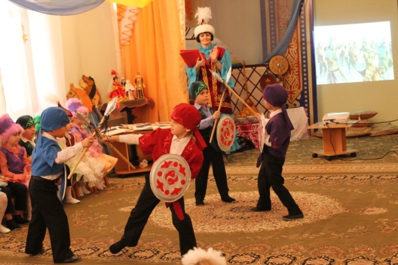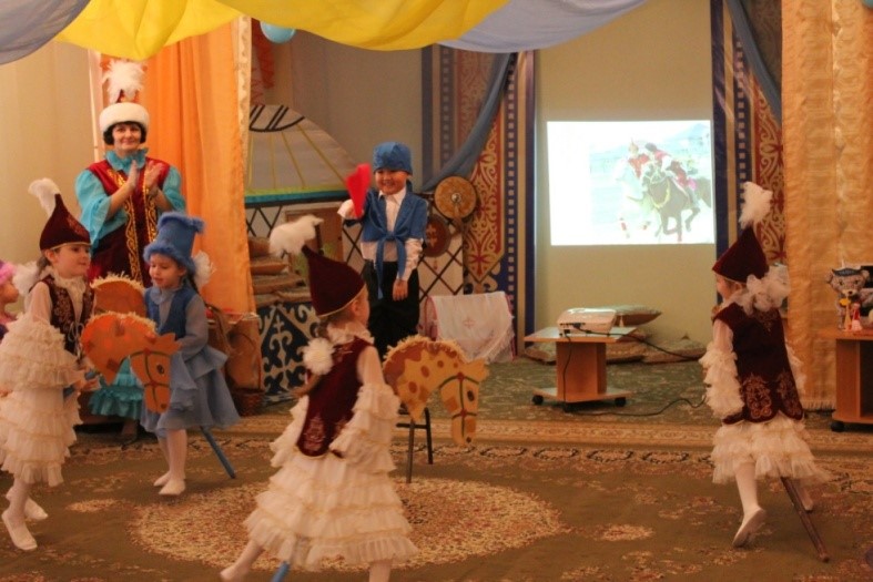 Дети исполняли песни на казахском и русском языках, играли в национальные игры, исполняли национальные танцы, читали стихи на двух языках.