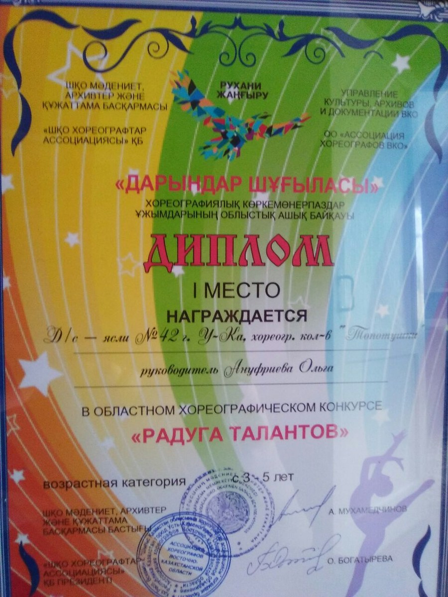 Хореографический коллектив «Топотушки» КГКП «Детский сад-ясли №42» акимата города Усть-Каменогорска под руководством Ануфриевой Ольги Анатольевны принял участие в областном хореографическом конкурсе «Радуга талантов» и занял 1 место.